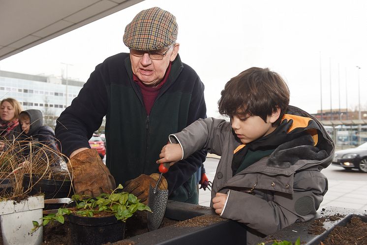 Milton Keynes Model Railway Society and local children fill planters at Milton Keynes station